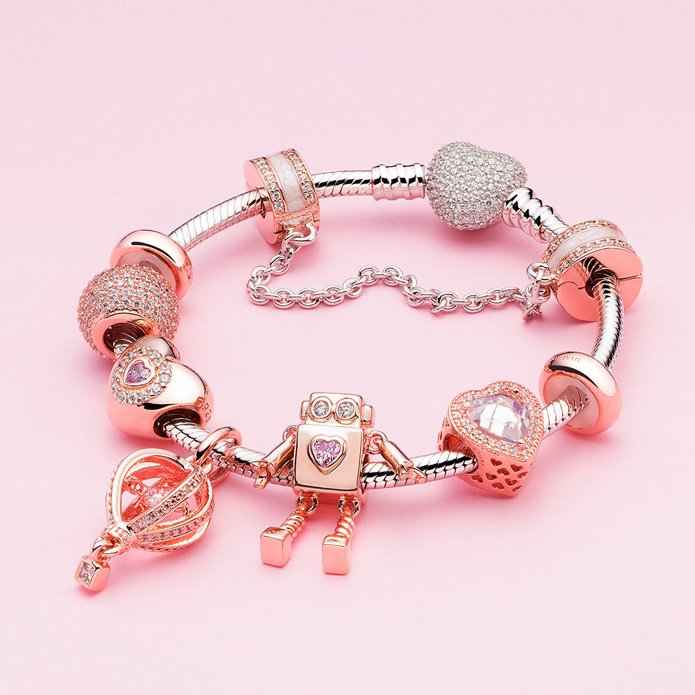 The Golden Harmony Safety Chain is designed to symbolize balance, unity, and graceful protection. The harmonious blend of rose gold tone, white enamel, and sparkling zirconia evokes a sense of calm and elegance. It not only prevents bracelet loss but adds a refined finish to your charm arrangement.