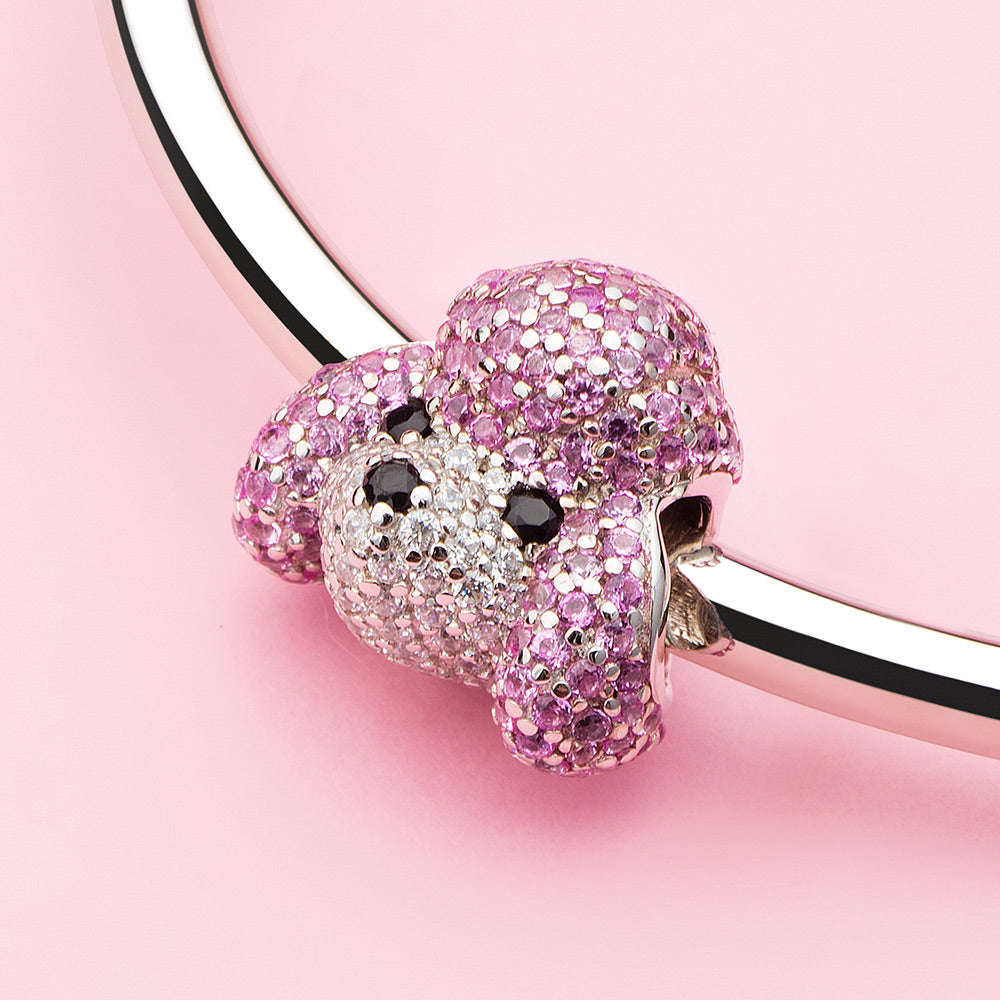 The Pink Poodle charm celebrates the elegance and playful spirit of our canine companions. Crafted in 925 sterling silver and embellished with sparkling pink zirconia, this poodle-shaped bead is both whimsical and chic. With its polished finish and refined detailing, the charm reflects loyalty, friendship, and fashionable flair—perfect for dog lovers who want to carry their affection in style. Whether it reminds you of a beloved pet or simply brings a smile, it adds charm and character to any bracelet.