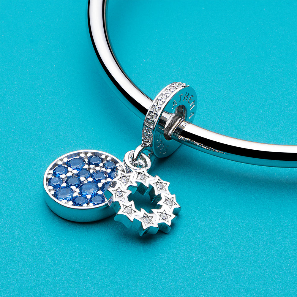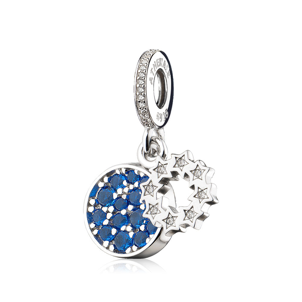 The Starry Night Pendant Charm draws inspiration from the dazzling night sky, featuring shimmering blue accents and brilliant cubic zirconia that evoke a sense of wonder and serenity. Crafted in 925 sterling silver with platinum plating, this charm adds a celestial elegance to your jewelry collection.
