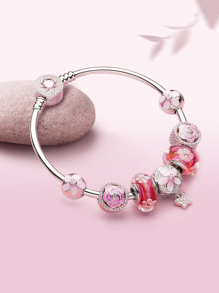 Sterling Silver Pink Enamel CZ Clasp Charm Bangle Bracelet