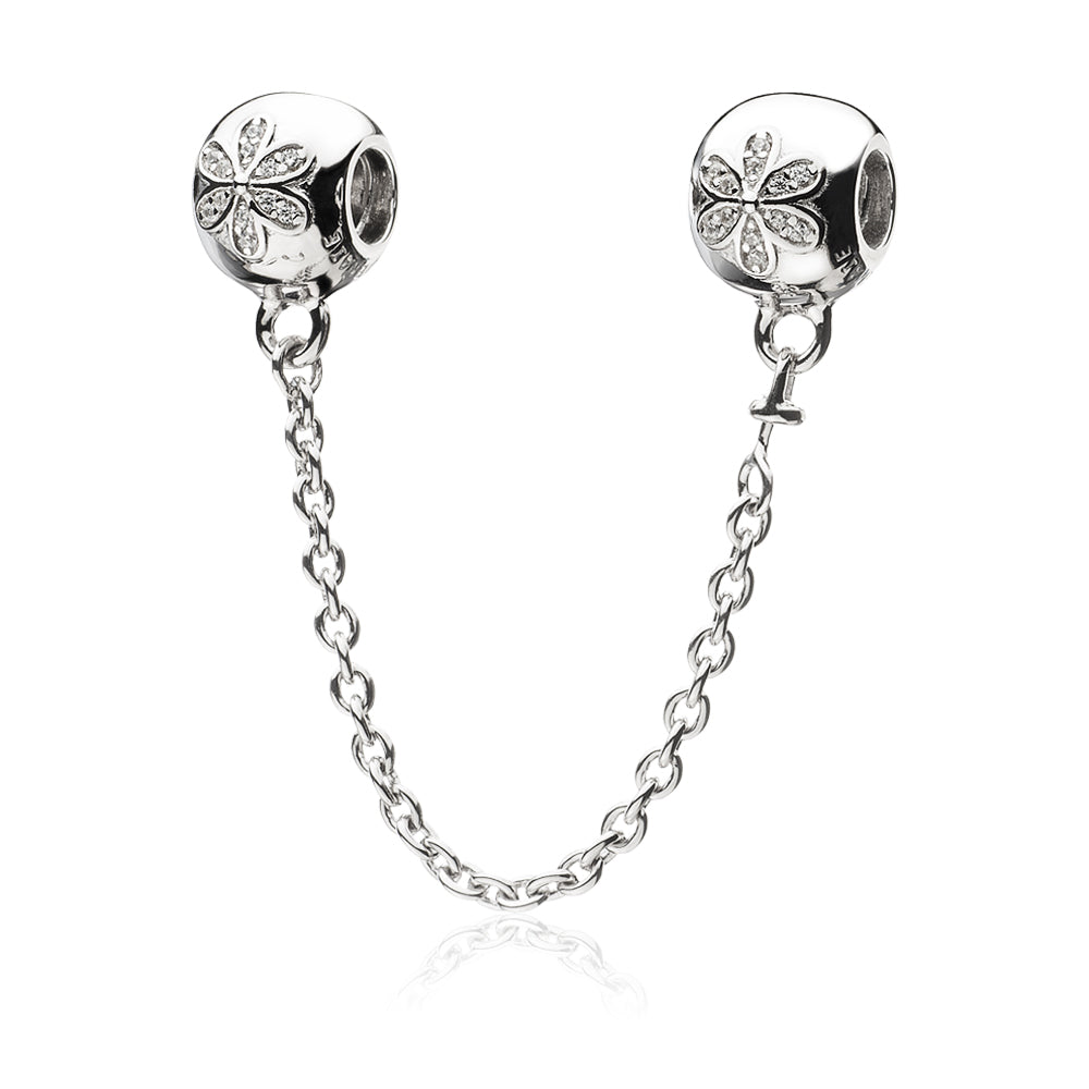 The Twin Daisies Safety Chain symbolizes the protective bond between two souls. Featuring two delicate daisy flowers with sparkling zirconia centers, this charm expresses purity, love, and connection. Designed in sterling silver with expert micro pavé craftsmanship and rhodium plating, it adds both beauty and function by preventing your charms from falling off. This floral-themed safety chain is ideal for women who value elegance with a deeper emotional meaning in their jewelry.
