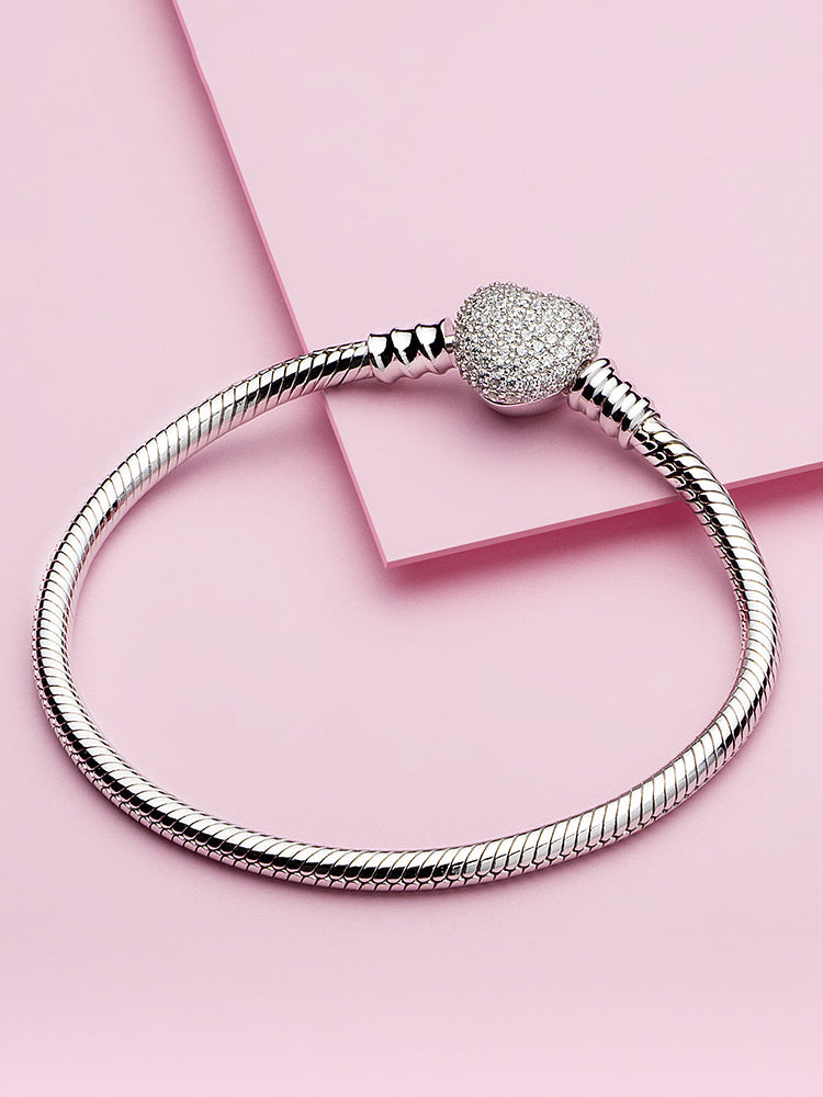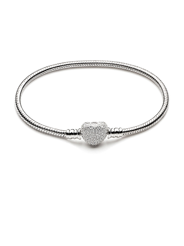 Pulseira de prata de lei com pingente e fecho em formato de coração cravejado de pavé.